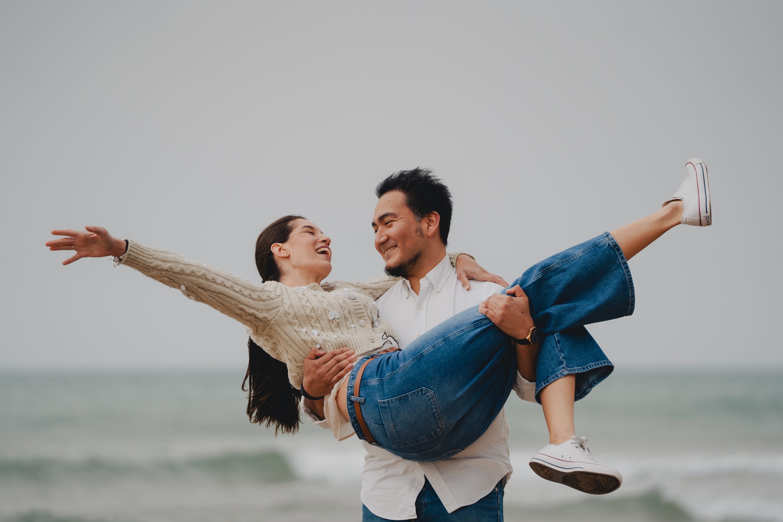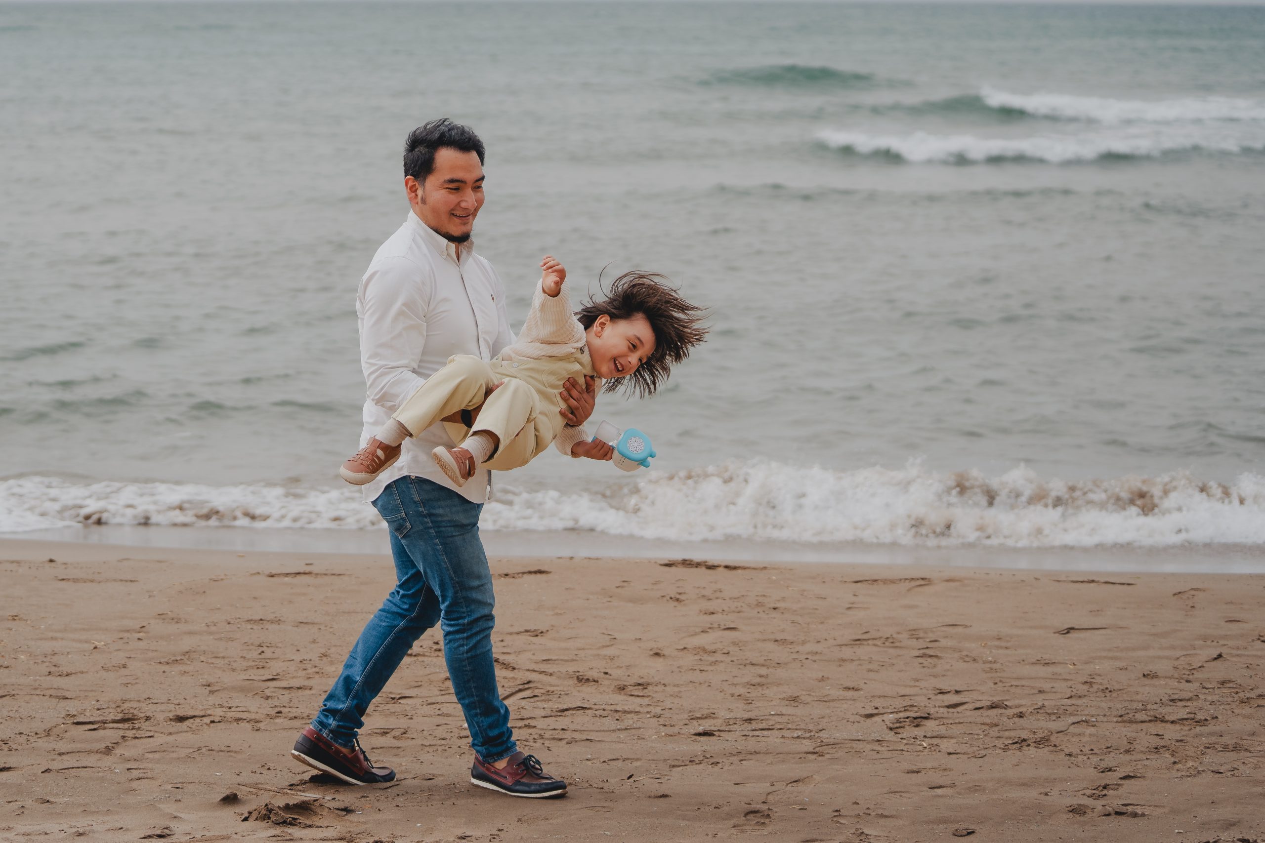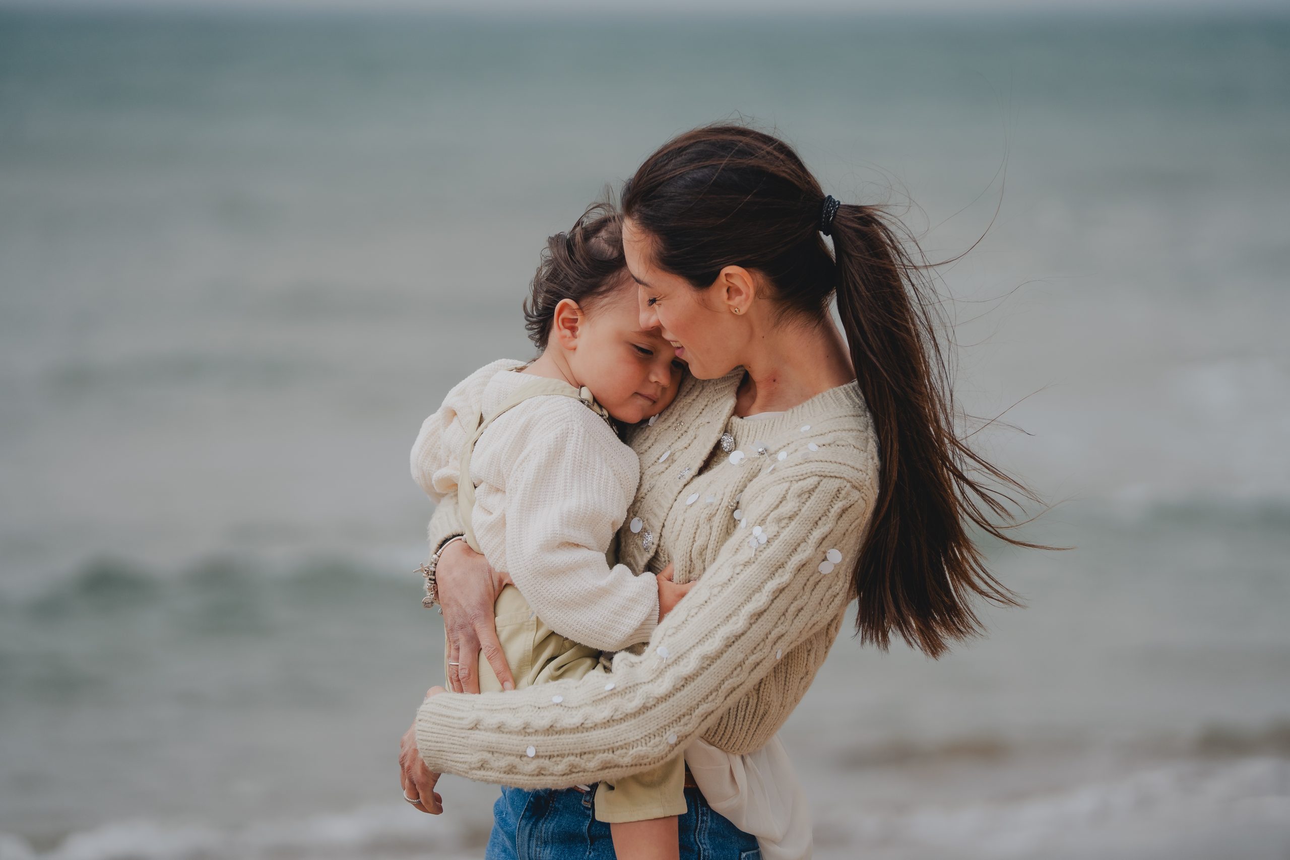 La luz de la mañana en la playa del Garraf es suave y muy natural, perfecta para este tipo de sesiones familiares en Barcelona. El mar tranquilo, el sonido de las olas y el espacio abierto ayudan a que todo suceda de forma espontánea.